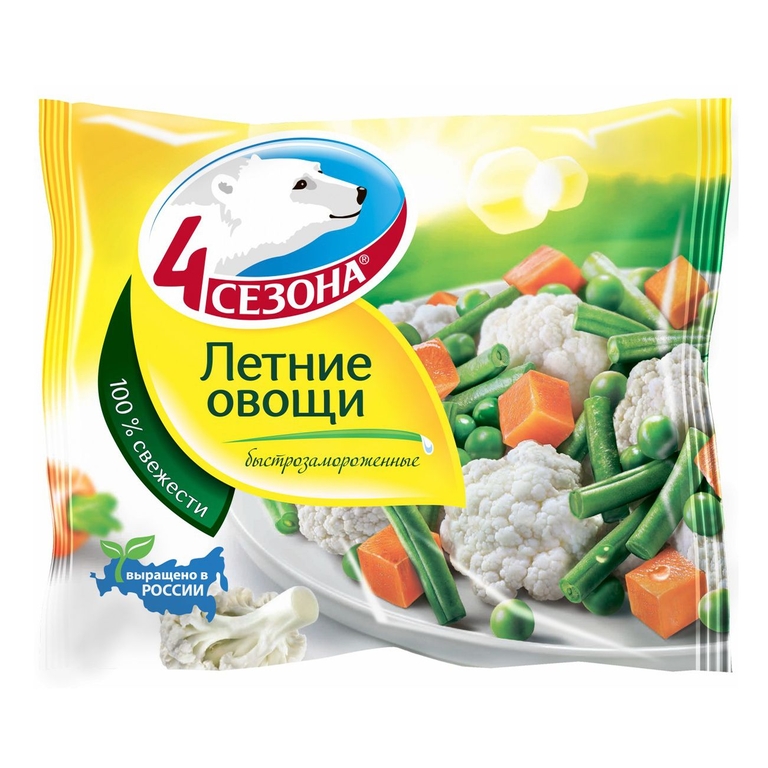 состав: молодой картофель, морковь, зелёный горошек, стручковая фасоль, цветная капуста (см. на упаковке);